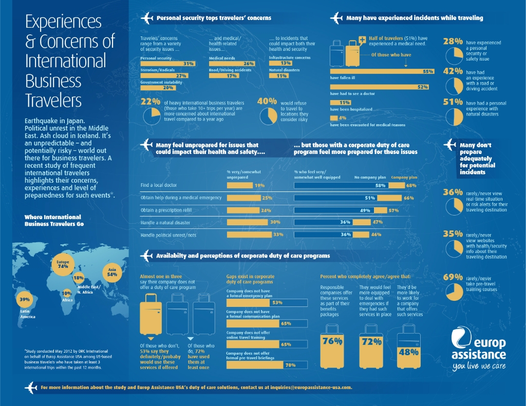 “With recent events such as the earthquake in Japan, political unrest in the Middle East and the ash cloud in Iceland, it’s an unpredictable and potentially risky world out there for business travelers,” said Glenn Maykish, vice president of sales and marketing for EA USA. “Understanding employee experiences and fears can help organizations better serve and protect their valuable employees while away from home.”