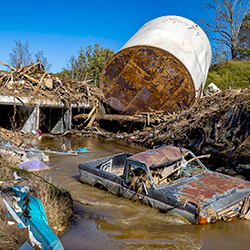 Hurricane Helene made landfall in Florida as a Category 4 storm, causing extensive damage with 140-mile-per-hour winds and massive storm surge-driven flooding. As the storm moved up the East Coast of the United States, it carved a path of death and destruction through Georgia and South Carolina before striking North Carolina with catastrophic impact. The storm killed more than 100 people in the state and devastated entire communities as record amounts of rainfall, flooding and tornadoes destroyed buildings, homes and infrastructure and caused widespread power outages. Much of the estimated $53 billion in storm-related and economic damage in North Carolina was uninsured. The storm also brought significant rainfall and flooding to parts of Tennessee, Virginia and Kentucky. Ultimately, Hurricane Helene killed more than 230 people and likely caused over $80 billion in damages.